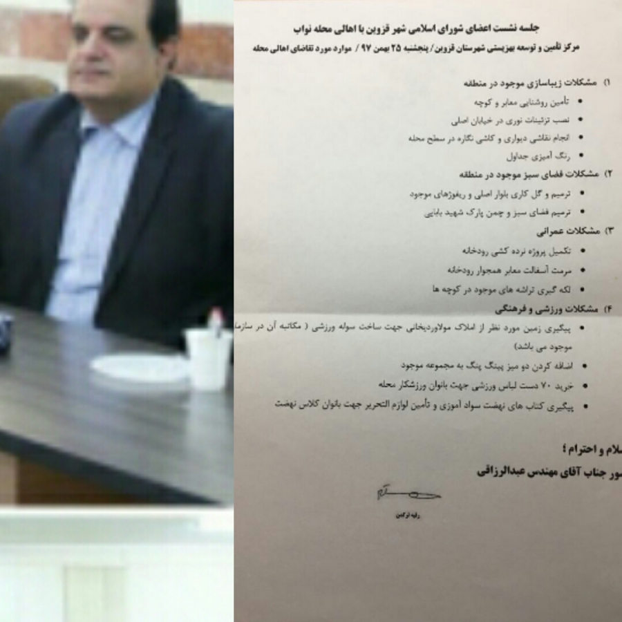 در پیوست آمده که پس از دیدار حضوری اهالی محله نواب در تاریخ1397/11/25قرار شده درخواست ها دسته بندی شده و به آقای عبدالرزاقی از اعضای شورای شهر تحوبل گردد.