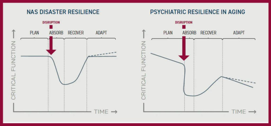 ما تاب آوری را به صورت توانایی بهبود یافتن از اختلال تعریف می کنیم که بر خلاف جلوگیری یا اجازه ندادن به ظهور آنهاست. این توصیف با تعریف آکادمی ملی علوم (NAS) از تاب آوری در مواجهه با بلایای طبیعی سازگار است, قالبی که می تواند برای تاب آوری برای افراد سالمند با کاربردهای روانپزشکی نیز به کار رود. عملکردهای حیاتی برای افراد سالخورده در یک تحلیل تاب آوری, می تواند شامل قابلیت استقلال در زندگی, یا مشارکت معنا دار در فعالیت های مشخص تعریف شود.
