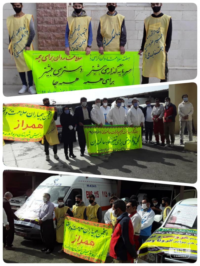 برپایی ایستگاه سلامت روان به مناسبت هفته سلامت روان توسط انجمن همیاران سلامت روان همراز دیوانده به مدت دو روز در شهرستان دیواندره برگزار گردید.نصب وتوزیع بروشورهای بهداشتی (پروتکل های بهداشتی) ،تهیه تراکت ها درخصوص رعایت کردن دستورالعمل ها بهداشتی و.....