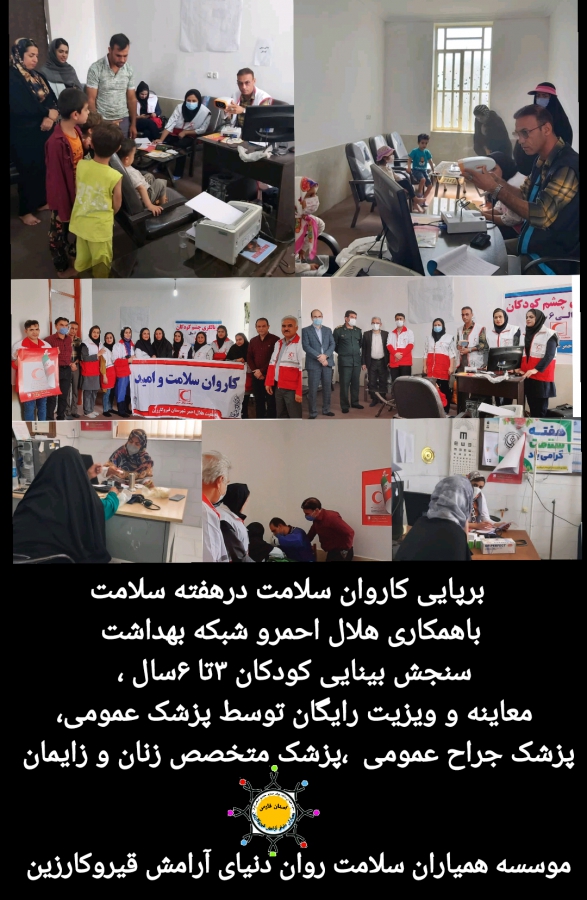 برپایی کاروان سلامت وامید با همکاری شبکه بهداشت و هلال احمر و انجام غربالگری بینایی کودکان  ۳ت۶سال ویزیت رایگان پزشک عمومی، جراح عمومی، پزشک متخصص زنان وزایمان در یکی از روستاهای محروم شهرستان