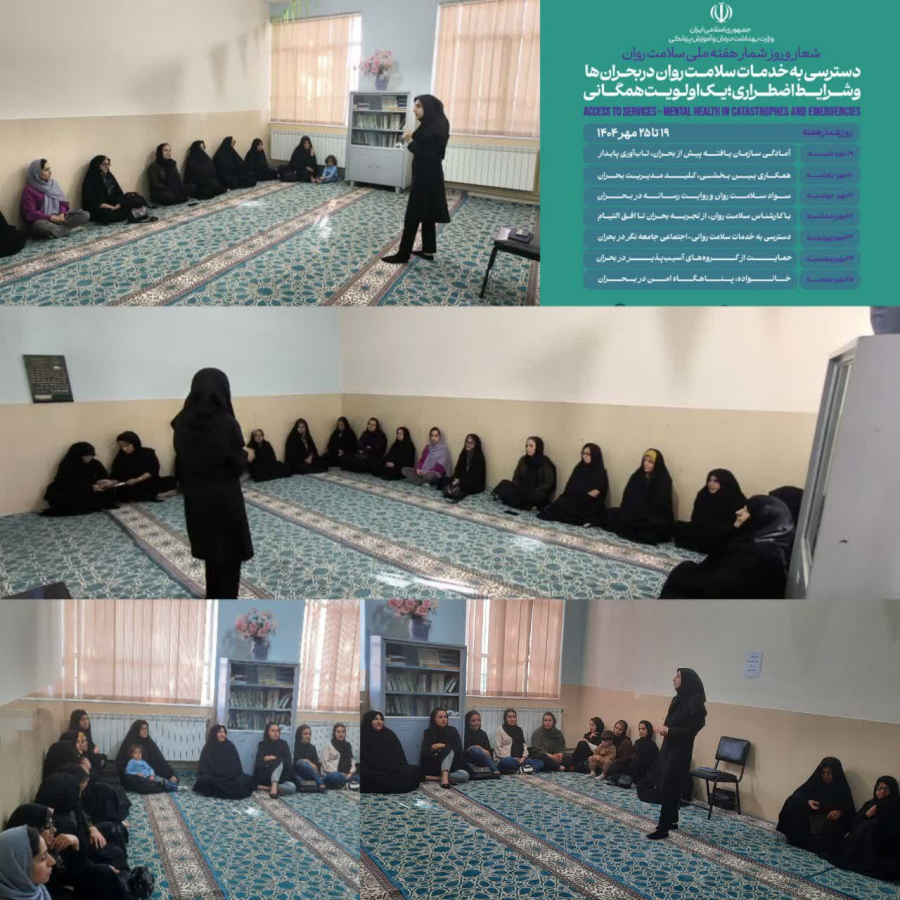 در روز یکشنبه ۲۰ مهرماه خانم ستاری همیار کوشای نسیم زندگی نایین جلسه آموزشی مدیریت بحران نوجوانی وحل تعارض با نوجوان را به مناسبت هفته سلامت روان در مدرسه طالقانی محمدیه برای ۳۰ نفر مخاطب برگزار کردند .