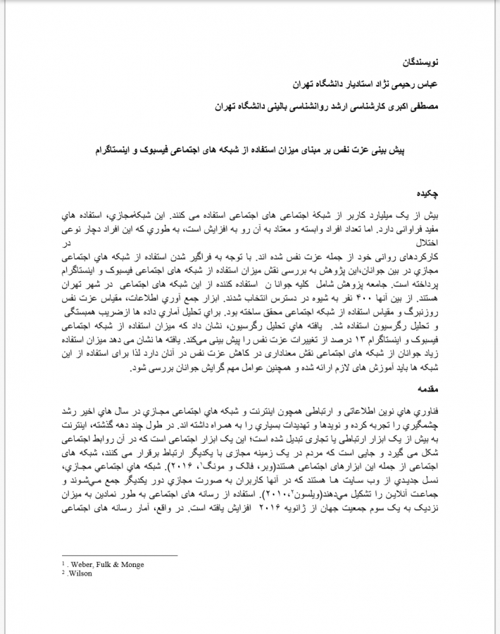 پیش بینی عزت نفس بر مبنای میزان استفاده از شبکه های اجتماعی فیس بوک و اینستاگرام