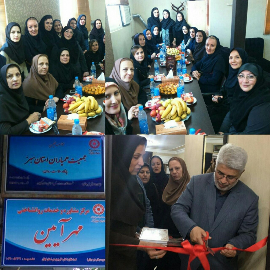 افتتاحیه مرکز مشاوره عمومی مهرآیین وابسته به جمعیت همیاران استان سبز با حضورجناب آقای عاقل منش ،عضو شورای شهر ،جناب آقای دکتر امیدی جانشین معاونت امور پیشگیری بهزیستی استان ،سرکار خانم انساندوست رئیس اداره بهزیستی شهرستان رشت به همراه هیات همراه و اعضای جمعیت همیاران استان سبز در مورخ 96/4/28در موسسه مهرآیین برگزار گردید.