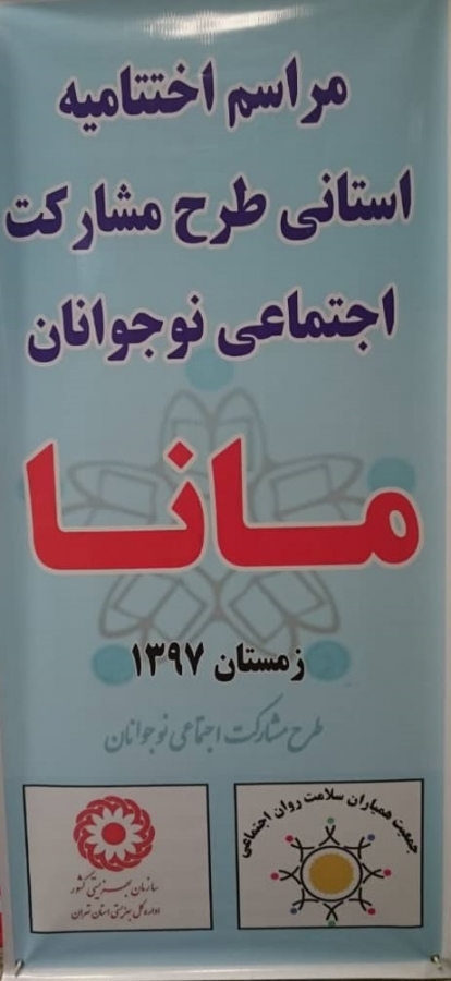 اختتامیه طرح مشارکت اجتماعی نوجوانان در پیشگیری از آسیب های اجتماعی (مانا)در مورخه 97/11/8 ساعت 9 الی 12 در محل سالن اجتماعات سازمان بهزیستی استان تهران با حضور مدیران پایگاه های سلامت روان اجتماعی مجری طرح، تسهیلگران و گروهی از نوجوانان شرکت کننده در طرح برگزار خواهدشد.