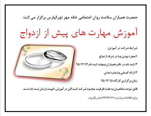 خانواده پایه هر جامعه ای است وازدواج همواره ازدغدغه های والدین ومدیران جامعه بوده است.در همین راستا جمعیت همیاران سلامت روان اجتماعی خانه مهر تهرانپارس برآن است که کارگاه آموزشی مهارت پیش از ازدواج را باکارشناسی خانم سیدآبادی استاد دانشگاه برگزارکند .از عزیزان آماده به ازدواج دعوت می شود که دراین کارگاه شرکت کنند.